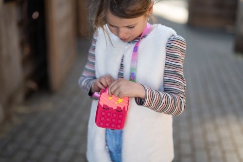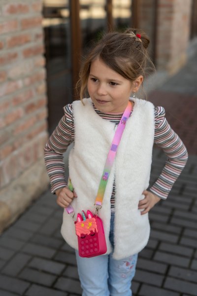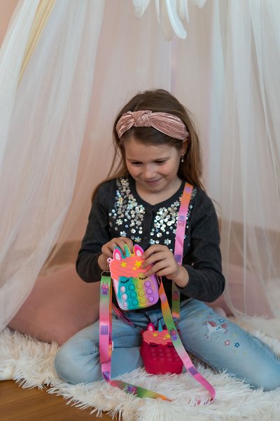Zmyslová hra Popit na malej kabelke jednorožec. Stláčaš rád bublinkovú fóliu!
