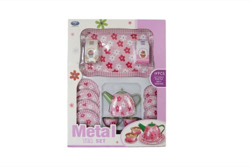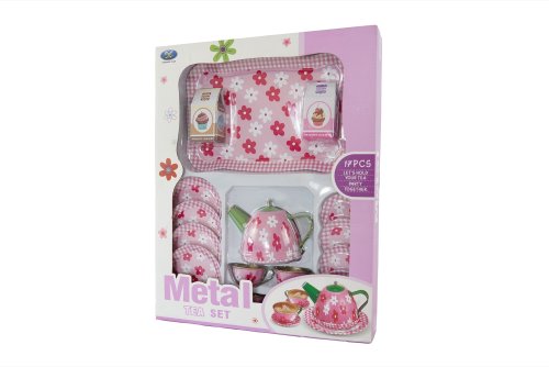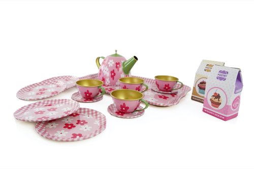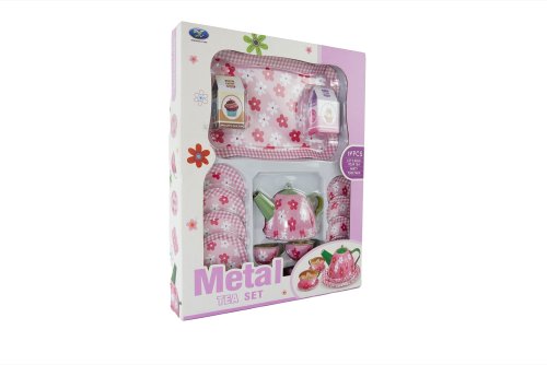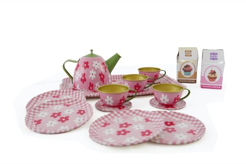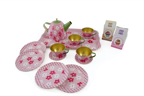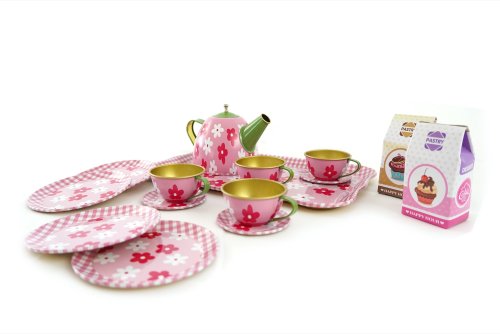 Naservíruj rodine popoludňajší čaj s kovovou sadou riadu. Sada obsahuje: 1x podnos, 1x čajovú kanvicu s pokrievkou, 4x šálku, 4x podšálku, 4x dezertný tanierik a 2x maketa potravín.