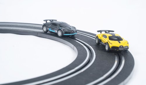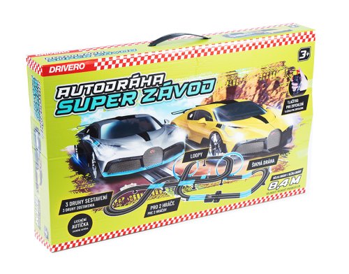 8,04 m dlhá autodráha na trafo. 3 rôzne druhy zloženia, 2 licenčné autíčka Bugatti.