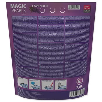 Silikátové podstielka pre mačky s jemnou vôňou levandule . Vďaka mikropórom na seba stelivo veľmi rýchlo viaže tekutiny, ktoré uzamkne vo vnútri kryštálov a eliminuje nepríjemný zápach . Tým zabraňuje množeniu nebezpečných baktérií. Vďaka tomuto inovatívnemu procesu má podstielka Magic Pearls extrémnu savosť a udržuje toaletu suchú a čistú . Stelivo Magic Pearls je bezprašné a nelepí sa na labkách a srsti zvierat, takže nie je mačkami vynášané mimo toalety. Stelivo je vhodné aj pre dlhosrsté plemená mačiek. Stelivo Magic Pearls v toalete vydrží absorbovať pachy a vlhkosť až 4 týždne (pri použití jednou mačkou), preto je jeho použitie taktiež veľmi ekonomické, nie je potrebné ho meniť tak často ako iné druhy podstielok.