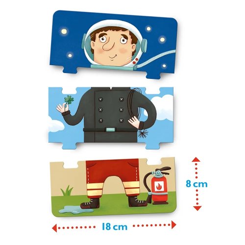 Astronaut so sukňou a hasičskou helmou? Kominár s putami a lekárskym plášťom? Alebo vám lepšie vyhovuje údržbárska kombinéza? Časti trojdielnych skladačiek je možné medzi sebou ľubovoľne zamieňať. S extra veľkými dielikmi si môžu malí milovníci puzzle ľahko vymýšľať svoje vlastné bláznivé práce. Hlavolam u detí hravou formou precvičí koncentráciu a kreativitu, ďalej sa tiež naučí niečo o zamestnaní. Hlavné vlastnosti: rozvíja predstavivosť a koncentráciu zlepšuje obratnosť a koordináciu ruka-okoskvelé pre edukáciu o práci