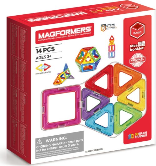 Magformers-14 je základná geometrická sada, z ktorej je možné vytvoriť prekvapivo mnoho rôznych jednoduchých stavieb, zvierat a geometrických telies. Balenie obsahuje 8 trojuholníkov a 6 štvorcov. Vhodné pre deti od 3 rokov. Počet dielikov: 14 Kreatívna magnetická stavebnica Magformers umožňuje zostavovať veľké množstvo trojrozmerných objektov, pomocou dvojrozmerných plastových mnohouholníkov. Magformers precvičuje jemnú motoriku, podnecuje tvorivosť, učí deti farby a základné geometrické tvary. Rozmery dielikov a vhodne volené tvary zaisťujú maximálnu možnú bezpečnosť hračky. Materiál, z ktorého je stavebnica vyrobená spĺňa najprísnejšie hygienické a zdravotné kritériá. Dieliky sú dostatočne veľké, nemožno ich prehltnúť a sú prakticky nerozbitné MAGFORMERS možno veľmi dobre kombinovať aj so známou magnetickou stavebnicou Geomag. ilustračné video magnetickej stavebnice Magformers