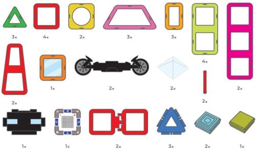 Trojuholník 3x Štvorec 4x Štvorec s kruhovým otvorom 2x Obdĺžnik 4x Obdĺžnik 3x Trojitý obdĺžnik 2x Lichobežník 3x Super lichobežník 2x Zrkadlový štvorec 1x Transform koliesko 2x Lux pyramídy 2x Nástavcová spojka 1x Spojka pre stĺpik 2x Battery pack 1x Audio modul 1x GEOMAG tyčka 2x