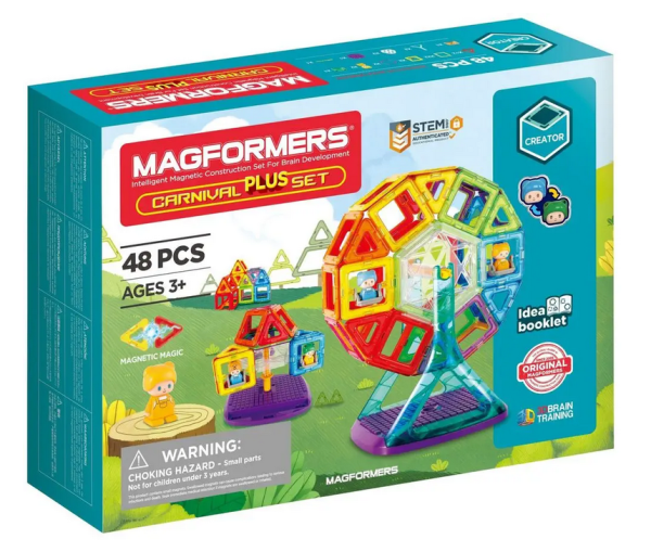 Magformers Carnival PLUS je tematická stavebnica, z ktorej je možné zostrojiť mnoho variácií točiacich sa púťových atrakcií (hojdačka, ruský bicykel, kolotoč). Dva štvorce majú pretáčavé sedačky pre postavičky jasajúcich detí, ktoré je možné do akejkoľvek atrakcie zabudovať ako skutočných pasažierov. Obsahuje dostatočný počet dielikov aj na stavby, ktoré postavíte z nižšej rady stavebníc, napr. Magformers-30. Pokiaľ už všetky magnetické dieliky naopak máte, stačí si prikúpiť samostatné „Carnival príslušenstvo“ (avšak v staršej verzii). Počet dielikov: 48 dielikov + obrázkový návod: