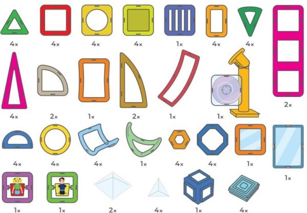 Trojuholník 4x Vysoký trojuholník 4x Štvorec 4x Štvorec s kruhovým otvorom 4x Štvorec s fixnou výplňou 4x Štvorec s mriežkou 1x Obdĺžnik 4x Trojitý obdĺžnik 2x Výsek 2x Oblúk 1x Mini 1x Polkruh 4x Kruh 4x Polvalec 4x Trojcípy oblúk 1x MINI šesťuholník 4x MINI osemuholník 4x Figúrka 2x Zrkadlový štvorec 1x Zrkadlový obdĺžnik 1x Spinner + príslušenstvo 1x Lux 4x Nadstavec kocky 1x Spojka pre stĺpik 4x