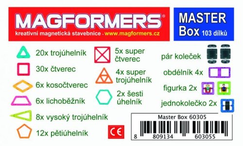 Kreatívna magnetická stavebnica Magformers umožňuje zostavovať veľké množstvo trojrozmerných objektov pomocou dvojrozmerných plastových mnohouholníkov. Magformers precvičuje jemnú motoriku, podnecuje tvorivosť, učí deti farby a základné geometrické tvary. Rozmery dielikov a vhodne volené tvary zaisťujú maximálnu možnú bezpečnosť hračky. Materiál, z ktorého je stavebnica vyrobená spĺňa najprísnejšie hygienické a zdravotné kritériá. Dieliky sú dostatočne veľké, nemožno ich prehltnúť a sú prakticky nerozbitné MAGFORMERS možno veľmi dobre kombinovať aj so známou magnetickou stavebnicou Geomag. ilustračné video magnetickej stavebnice Magformers