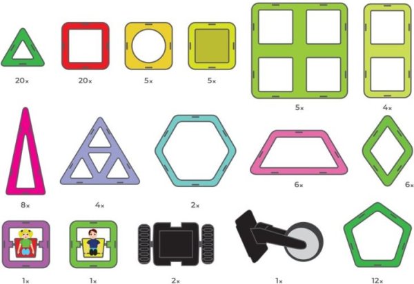 Trojuholník 20x Vysoký trojuholník 8x SUPER trojuholník 4x Štvorec 20x Štvorec s kruhovým otvorom 5x Mriežka 5x Štvorec s fixnou výplňou 5x Obdĺžnik 4x Kosoštvorec 6x Lichobežník 6x Päťuhol Moto koliesko 1x Kolieska 2x