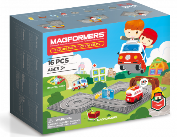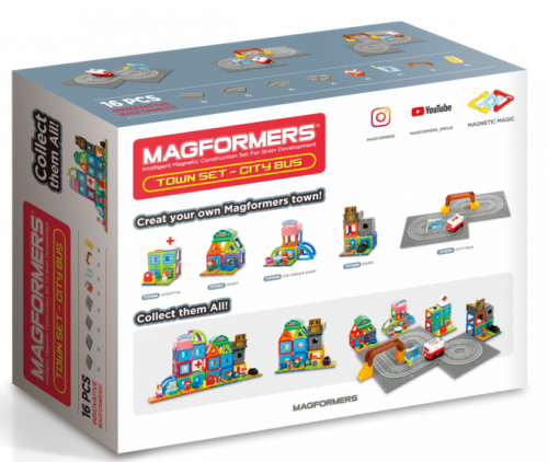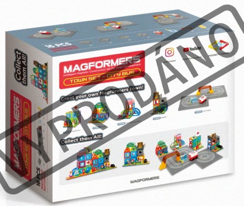 Sada obsahuje 11 kusov panelov s vodiacou drážkou pre autobus, ktorý je opatrený vlastným pohonom napájaným z 2 batérií typu AAA (nie sú súčasťou balenia), sklopnú závoru a mostík pre peších. Z panelov je možné zostaviť rôzne druhy dopravných komunikácií. Roztomilý autobus prechádza po mestečku dookola po zostavenej ceste (konečný návrh rozvrhnutia je len na vás). Na čelnej maske autobusu je dotykový spínač, ktorý pri nabehnutí do sklopnej „Stop-Go“ bariéry (závory) autobus v jazde zastaví. Akonáhle závoru nadvihnete, autobus pokračuje vo svojej okružnej jazde mestečkom ďalej. Autobus je navádzaný výklopným ramienkom s háčikom, ktorý udrží pri jazde požadovaný smer pozdĺž navádzacej drážky. Prepínač „free play“ umožňuje jazdu autobusu aj po rovných plochách mimo drážkových panelov. Súprava „Autobus“ je kompatibilná so všetkými sadami Magformers a je vhodné ju kombinovať s ostatnými sadami série „MESTOČKO“ (Town set). Typické je využitie ako centrálnej časti mesta, ktoré je možné okolo postaviť z ľubovoľných dielikov stavebníc Magformers. Táto sada neobsahuje žiadne magnetické dieliky, avšak je možné využiť aj samostatne bez potreby iných dielikov Magformers. V tom prípade získate len samotnú „autodráhu“ s busom, závorou a mostíkom. Stavebnice série MAGFORMERS Mestečko (Town set) sú navrhnuté tak, aby si malí stavitelia mohli vybudovať svoje vlastné obce a mestá podľa vlastných predstáv. Na výber majú celkom 5 tematických sád: Nemocnice, Trhovisko, Cukráreň, Banka a Autobus. Každú z nich môžete využiť aj samostatne (vrátane sady Autobus, ktorá bude však sama o sebe len malou autodráhou s autobusom a pár doplnkami bez magnetov). Oveľa zaujímavejšie bude nakombinovať 2 alebo viac sád Mestečka naraz (možno postupne prikupovať) alebo doplniť o akékoľvek iné dieliky stavebníc Magformers, aby celé mestečko ožilo a ponúklo malým architektom netušené možnosti celú scénu rozšíriť a obmieňať. Stavebnice série Mestečko sú plne kompatibilné so všetkými inými dielikmi Magformers. Pokiaľ nazbierate všetkých 5 typov mestečka, získajú stavby na pestrosti a môžete si vystavať svoje vlastné mesto podľa vašej predstavivosti. S mestečkom si môžete užiť ešte viac zaujímavých príbehov. Sada obsahuje: 11 kusov panelov s vodiacou drážkou a 4x plastové príslušenstvo (ktoré tvoria závoru a mostík) a pojazdný autobus Vhodné pre deti od 3 rokov. Počet dielikov: 16 Na prevádzku sú potrebné batérie 2ks AAA (nie sú súčasťou balenia). Kreatívna magnetická stavebnica Magformers umožňuje zostavovať veľké množstvo trojrozmerných objektov pomocou dvojrozmerných plastových mnohouholníkov. Magformers precvičuje jemnú motoriku, podnecuje tvorivosť, učí deti farby a základné geometrické tvary. Rozmery dielikov a vhodne volené tvary zaisťujú maximálnu možnú bezpečnosť hračky. Materiál, z ktorého je stavebnica vyrobená spĺňa najprísnejšie hygienické a zdravotné kritériá. Dieliky sú dostatočne veľké, nemožno ich prehltnúť a sú prakticky nerozbitné. MAGFORMERS je možné veľmi dobre kombinovať aj so známou magnetickou stavebnicou Geomag.