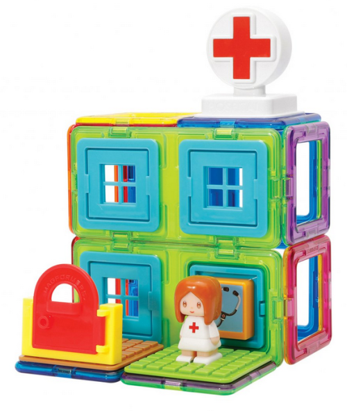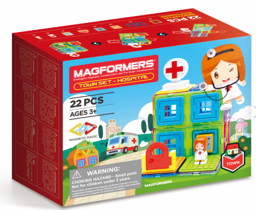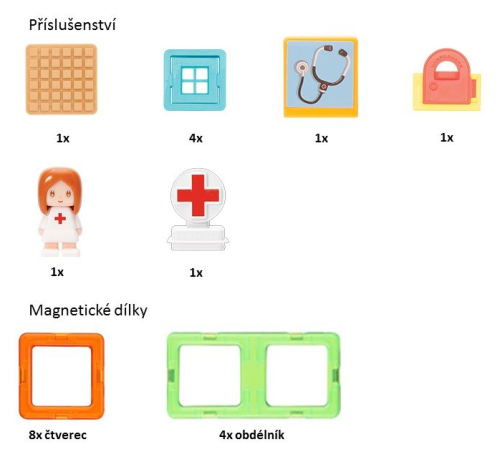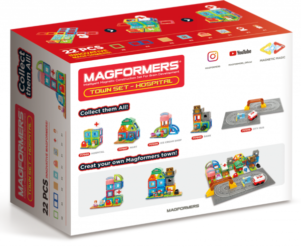 Obsahuje 12 magnetických tvarov a 9 funkčných doplnkov vr. malé lekárky. Je možné zostavovať rôzne architektonicky riešené tvary nemocnice podľa vlastnej fantázie. Pridaním ďalších dielikov Magformers získa vaša nemocnica na veľkosti a rôznorodosti. Výsledné stavby majú formu poloodkrytého prierezu, kde sú z jednej strany viditeľné vonkajšie kontúry stavby az druhej interiérové riešenie, ktoré môžete postupne obmieňať. Vhodné pre kreatívne kombinovanie s ostatnými sadami série „MESTOČKO“ (Town set). Stavebnice série MAGFORMERS Mestečko (Town set) sú navrhnuté tak, aby si malí stavitelia mohli vybudovať svoje vlastné obce a mestá podľa vlastných predstáv. Na výber majú celkom 5 tematických sád: Nemocnice, Trhovisko, Cukráreň, Banka a Autobus. Každú z nich môžete využiť aj samostatne (vrátane sady Autobus, ktorá bude však sama o sebe len malou autodráhou s autobusom a pár doplnkami bez magnetov). Oveľa zaujímavejšie bude nakombinovať 2 alebo viac sád Mestečka naraz (možno postupne prikupovať) alebo doplniť o akékoľvek iné dieliky stavebníc Magformers, aby celé mestečko ožilo a ponúklo malým architektom netušené možnosti celú scénu rozšíriť a obmieňať. Stavebnice série Mestečko sú plne kompatibilné so všetkými inými dielikmi Magformers. Pokiaľ nazbierate všetkých 5 typov mestečka, získajú stavby na pestrosti a môžete si vystavať svoje vlastné mesto podľa vašej predstavivosti. S mestečkom si môžete užiť ešte viac zaujímavých príbehov. Sada obsahuje: 8 štvorcov, 4 obdĺžniky, 9x plastové príslušenstvo, 1 postavička Vhodné pre deti od 3 rokov. Počet dielikov: 22 Kreatívna magnetická stavebnica Magformers umožňuje zostavovať veľké množstvo trojrozmerných objektov, pomocou dvojrozmerných plastových mnohouholníkov. Magformers precvičuje jemnú motoriku, podnecuje tvorivosť, učí deti farby a základné geometrické tvary. Rozmery dielikov a vhodne volené tvary zaisťujú maximálnu možnú bezpečnosť hračky. Materiál, z ktorého je stavebnica vyrobená spĺňa najprísnejšie hygienické a zdravotné kritériá. Dieliky sú dostatočne veľké, nemožno ich prehltnúť a sú prakticky nerozbitné. MAGFORMERS je možné veľmi dobre kombinovať aj so známou magnetickou stavebnicou Geomag.