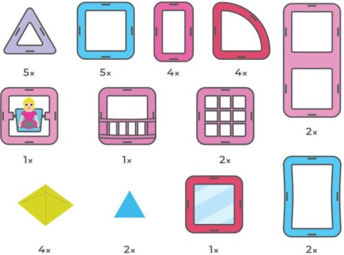 Trojuholník 5x Štvorec 5x Obdĺžnik 2x Obdĺžnik 4x Výsek 4x Oblúk 2x Figúrka Princezná 1x Zrkadlový štvorec 1x Balkón 1x Okno delené 2x Lux pyramídy Color 4x Lux, pyramídy trojboke 2