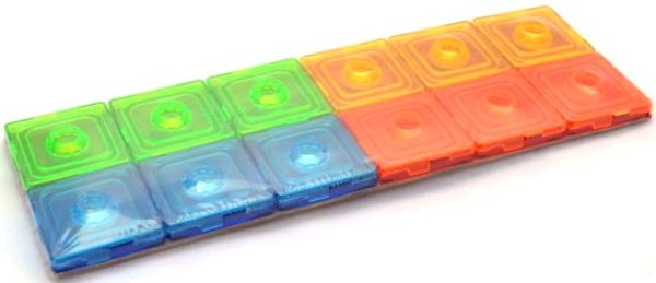 Balenie 12 nemagnetických otočných panelov v štyroch farbách. Ide o dielik, ktorý je nevyhnutný na pripevňovanie niektorých doplnkov ako sú napr. vrtule, magnetické kĺby, guľomet alebo satelitná anténa. Panel má tvar štvorca dĺžke strany 4,3 cm. Tvar obvodu panelu je navrhnutý tak, aby sa dal natesno vložiť dovnútra klasického štvorca (popr. obdĺžnika) jednoduchým zacvaknutím. Farby dielikov dodávame podľa skladových zásob. Počet dielikov: 12 Kreatívna magnetická stavebnica Magformers umožňuje zostavovať veľké množstvo trojrozmerných objektov, pomocou dvojrozmerných plastových mnohouholníkov. Magformers precvičuje jemnú motoriku, podnecuje tvorivosť, učí deti farby a základné geometrické tvary. Rozmery dielikov a vhodne volené tvary zaisťujú maximálnu možnú bezpečnosť hračky. Materiál, z ktorého je stavebnica vyrobená spĺňa najprísnejšie hygienické a zdravotné kritériá. Dieliky sú dostatočne veľké, nemožno ich prehltnúť a sú prakticky nerozbitné. MAGFORMERS je možné veľmi dobre kombinovať aj so známou magnetickou stavebnicou Geomag. ilustračné video magnetickej stavebnice Magformers
