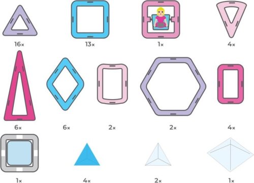 Trojuholník 16x Vysoký trojuholník 6x Štvorec 13x Obdĺžnik 4x Kosoštvorec 6x Šesťuholník 2x Minivýsek 4x Oblúčik 2x Figúrka Princezná 1x Lux pyramídy 1x Lux,pyramídy trojboké 2x Lux 1x (obsahuje 1 kus vymeniteľnej plochej batérie CR2032)