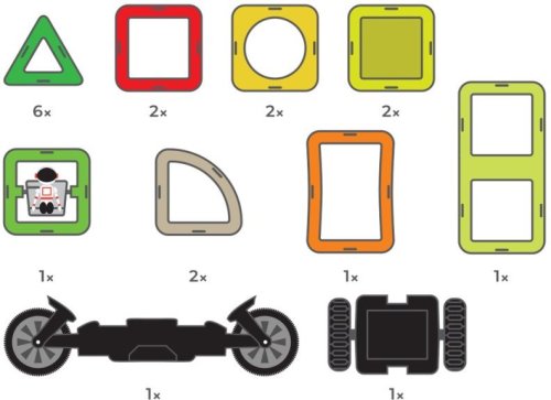 Trojuholník 6x Štvorec 2x Štvorec s kruhovým otvorom 2x Štvorec s fixnou výplňou 2x Obdĺžnik 1x Výseč 2x Oblúk 1x Figúrka Kozmonaut 1x Transform koliesko 1x Kolieska 1x