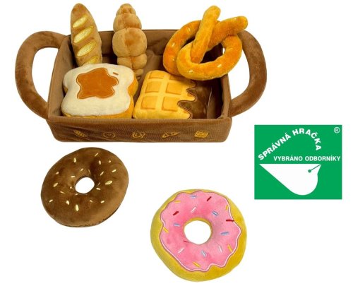 Plyšový košík s pečivom je nevyhnutným doplnkom pri hraní sa na pekáreň alebo predaj pečiva v obchode, ale nájde aj svoje využitie aj v detskej kuchynke. Vyšívaná tematická plyšová hračka z veľmi kvalitnej plyšu. Sada obsahuje košík a 7 imitácií pečiva: slaný rožok, praclík, croissant, 2x donut, vafli a toast s medom. Použité materiály: Vrchná látka a výplň 100% polyester, vnútorné výstuže košíka - plast. Ručné pranie a čistenie vlhkou handričkou. Vhodné pre deti od 2 rokov.