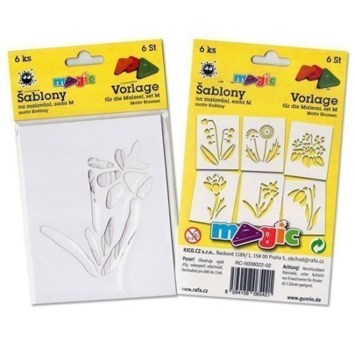 Sada 6ks papierovej šablóny na maľovanie. Materiál biely kartón 220g. Odporúčame na maľovanie s magickými voskovkami (technika frotáž), vhodné aj na tupovanie s temperami, na maľovanie s fúkacími fixkami alebo techniku maľovania plastelínou. Rozmery 11x14cm.