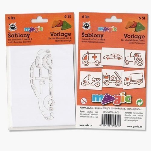 Sada 6ks papierovej šablóny na maľovanie. Materiál biely kartón 220g. Odporúčame na maľovanie s magickými voskovkami (technika frotáž), vhodné aj na tupovanie s temperami, na maľovanie s fúkacími fixkami alebo techniku maľovania plastelínou. Rozmery 11x14cm.