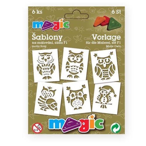 Sada 6ks papierovej šablóny na maľovanie. Materiál biely kartón 220g. Odporúčame na maľovanie s magickými voskovkami (technika frotáž), vhodné aj na tupovanie s temperami, na maľovanie s fúkacími fixkami alebo techniku maľovania plastelínou. Rozmery 11x14cm.