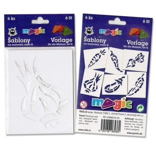 Sada 6ks papierovej šablóny na maľovanie. Materiál biely kartón 220g. Odporúčame na maľovanie s magickými voskovkami (technika frotáž), vhodné aj na tupovanie s temperami, na maľovanie s fúkacími fixkami alebo techniku maľovania plastelínou. Rozmery 11x14cm.