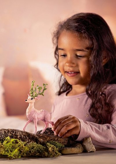 Objav svet hrou s autentickými a prepracovanými figúrkami Schleich®. Vyzerajú tak skutočne, že sa možno každú chvíľu samy od seba rozbehnú! Keď sa v lese BAYALA® objaví magický jeleň, upúta pozornosť všetkých. Ako krásne sa zlaté parožie trblietajú na slnku. Je zdobené ružami, ktoré ladia s ružovou srsťou jeleňa. Na čele má peknú kresbu mandaly. Jeho hruď a kopytá sú posiate trblietkami, ktoré odrážajú slnečné lúče. Jednoducho kúzelné! Rozmery figúrky: 12,9 x 9 x 4,7 cm. Vek: 5-12
