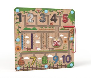 Vydajte sa na cestu prírodou s farebnými guličkami. Vykonáte úspešne rôznofarebné guličky všetkými zákutiami? Umiestnite všetky do mlyna? Zmestia sa tam? Alebo pomocou čísel na metre vytvoríte a vypočítate príklad? Na vedenie guličiek sa pri hre využíva magnetické ukazovátko, ktoré preverí detskú trpezlivosť a koordináciu rúk a zraku. Dokážete potom navrátiť guličky späť na svoje miesto podľa farby? Je počet guličiek rovnaký ako číslo, do ktorého ste ich umiestnili? Zábavná drevená hra, ktorá pomáha deťom rozvíjať jemnú motoriku, orientovať sa v priestore a rozširovať slovnú zásobu pomenovávaním farieb a predmetov v meste. Deti sa tiež učia počítanie zábavnou formou. Drevená základňa v dizajne prírody je krytá odolnou priehľadnou plastovou doskou, hračka je vďaka tomu bezpečná. Rozmery: 29,5 x 29,5 x 1,5 cm Materiál: drevo, plast, magnet, tkanina