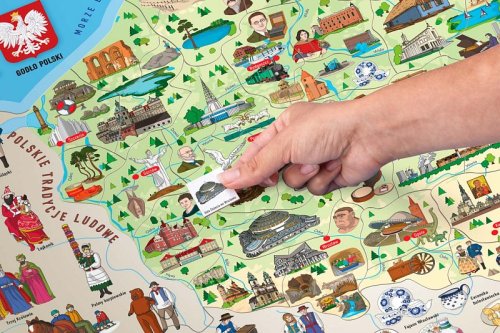 Náučné puzzle, školská pomôcka a spoločenská hra v jednom! Cieľom je naučiť vnímať dieťa svoju krajinu ako celok plný zaujímavostí. Súčasne sa tu dieťa naučí rozčleniť Poľsko do jednotlivých vojvodstiev a určiť ich hlavné mestá. Na podkladovej doske sú tiež zakreslené rieky a pohoria. Dieťa prikladá dieliky znázorňujúce jednotlivé okresy na podkladovú magnetickú plochu. Hranice jednotlivých vojvodstiev sú vyznačené výraznou linkou, ktorá pomôže dieťaťu určiť, kam ktorý dielik patrí. Neskôr už bezpečne vie a osvojí si znalosť, kde sa jednotlivé vojvostvá nachádzajú, s ktorými susedia atď... Vďaka obrázkom umiestneným na každom dieliku si deti ihneď uvedomia, čo je pre každý okres charakteristické, čo sa kde pestuje, vyrába, ťaží, kde aké zvieratá žijú, event., kde sa aká stavba, budova, hrad či zámok nachádza. S kompletne poskladanou mapou si potom s rodičmi alebo kamarátmi zahrajú hru, ktorá bystrí zmysly a trénuje postreh. Dizajn a kresby pochádzajú od českých návrhárov.| Vek: 3+ | Rozmer: 77 x 47 x 0,5 cm. | Toto autorské dielo je registrované u Art&Copyright pod číslom 215-15-21-01 zo dňa 26.3.2021.