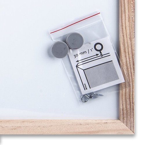 Biela magnetická tabuľa v drevenom ráme, súčasťou sú háčiky na zavesenie, 2 magnety a čierny fix na magnetickú tabuľu. Rám je z dreva borovice s hrúbkou 1,8 cm.