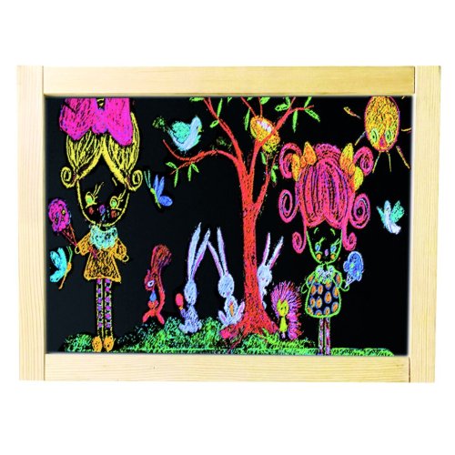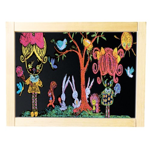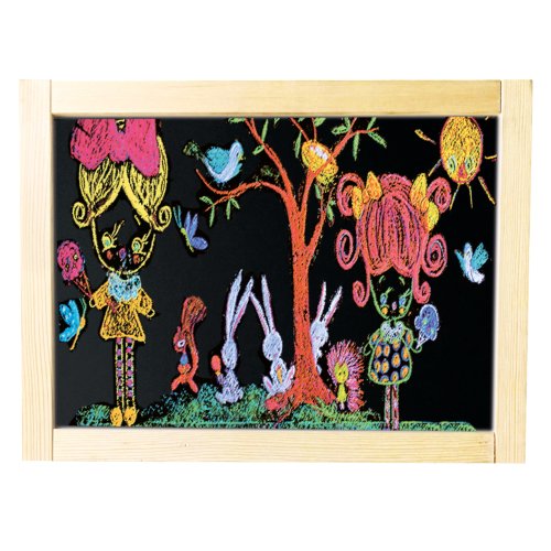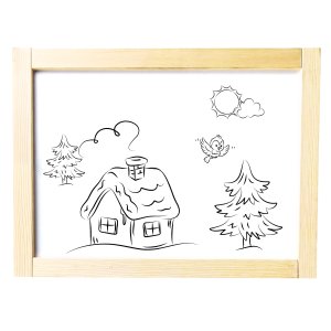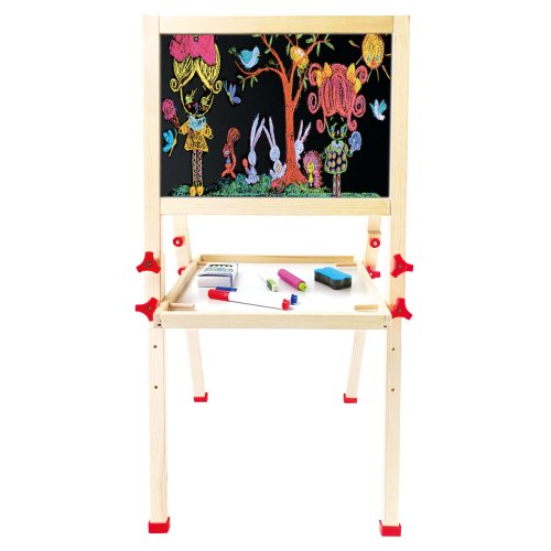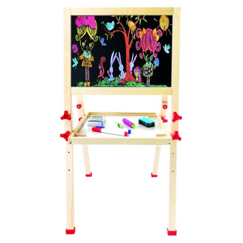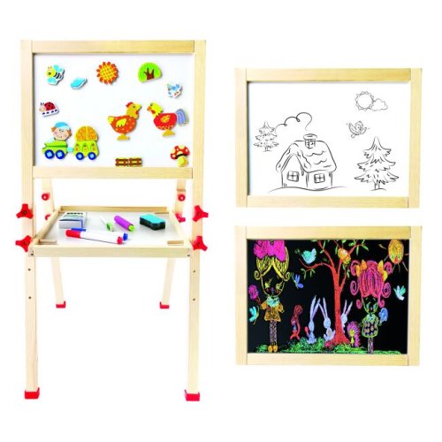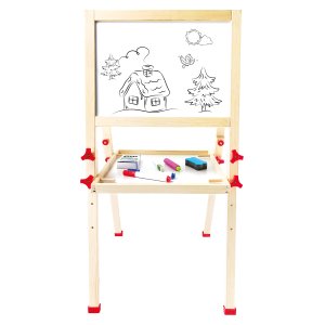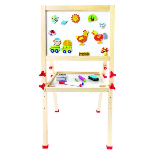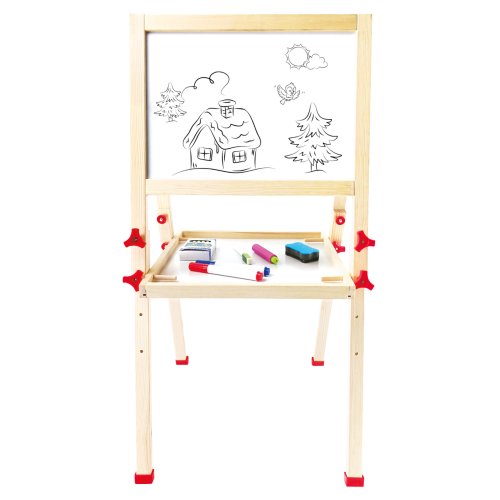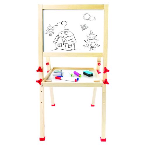 Detský drevený skladací stojan. Obsahuje 61 dielov. Jedna strana stojana je biela a magnetická, na ktorú sa dajú magnetom prichytiť rôzne obrázky, ktoré sú súčasťou balenia, alebo je určená na písanie fixkou.