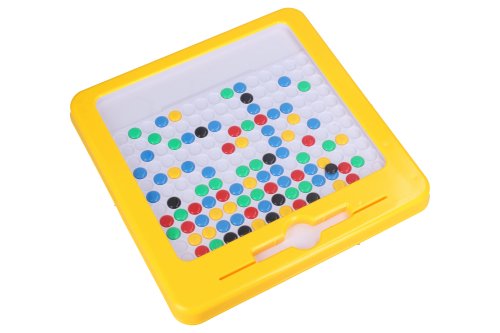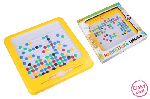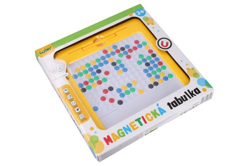 Magnetická tabuľka. Veľkosť 25cm. Pomocou priloženej magnetickej ceruzky sa umiestňujú farebné magnetky na potrebné miesta a tvorí sa tak ľubovoľný obrázok. Obsahuje predlohy s rôznymi obrázkami. Pritlačením magnetickej ceruzky na tabuľku sa magnetka prichytí k ceruzke, dá sa tak premiestniť a oddialením ceruzky od tabuľky magnetka spadne na príslušné miesto.