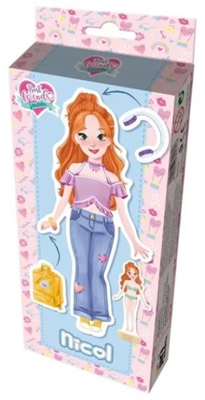 Balenie obsahuje obliekaciu postavičku, 3 archy magnetických častí oblečenia, topánok a doplnkov a drevený podstavec.