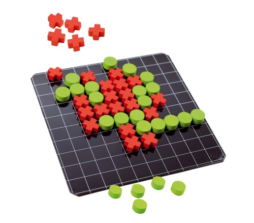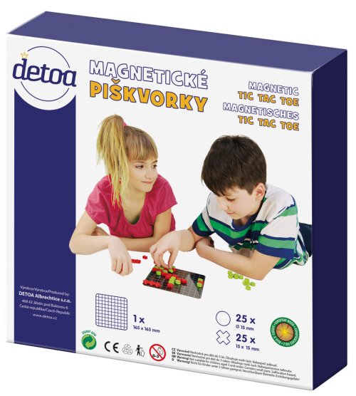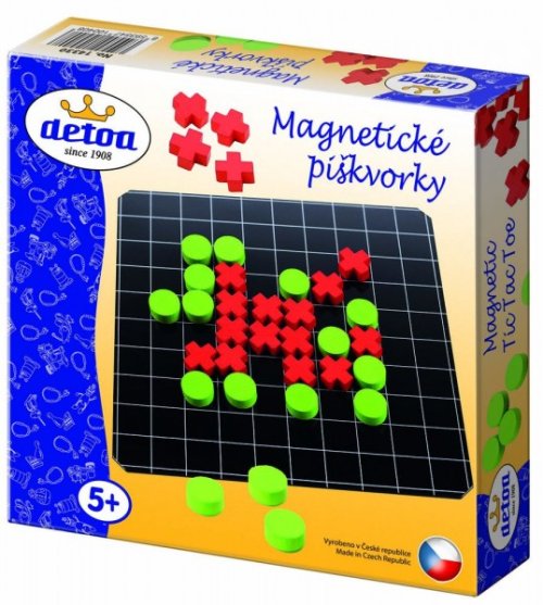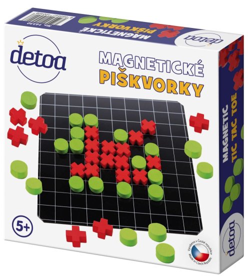 Obľúbená strategická hra pre dvoch hráčov v cestovnom prevedení. Hra obsahuje plechovú tabuľku s rozmermi 165x165 mm a drevené herné kamene (kolieska O 15 mm a kríža 16x16 mm) podlepené magnetom.
