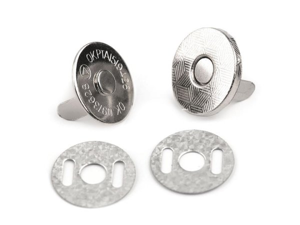 Tenké magnetické zapínanie obsahuje špeciálne silný magnet. Zapínanie využijete na klopy kabeliek, tašiek aj listových kabeliek. Návod na použitie: 1) Podľa nožičiek na magnete si vyznačíme prierezy a prestrihneme látku. 2) Nožičky magnetu prestrčíme tak, aby prešli látkou a vykukli na rubovej strane. 3) Na nožičky nasadíme kovový protikus, stlačíme k sebe a nožičky roztiahneme do strán. 4) Druhý diel nasadíme rovnakým spôsobom.