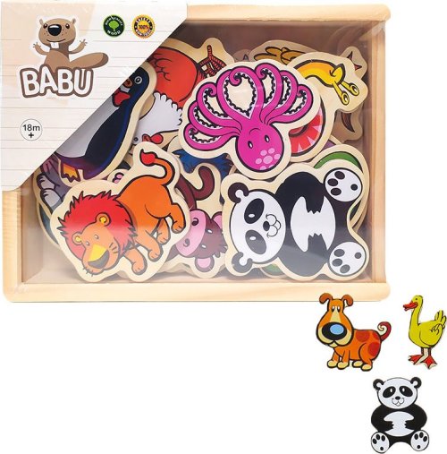 Drevené magnetky zvierat, v darčekovej drevenej krabičke. Sada obsahuje 20 magnetiek rôznych zvieratiek.