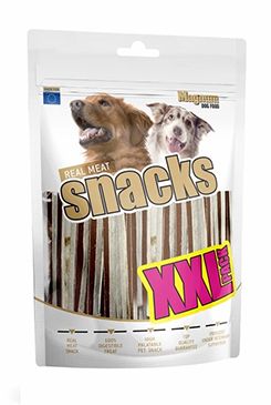 Mäkká, prírodná mäsová pochúťka z kuracieho mäsa formovaná do mäkkých prúžkov. Každodenná pochúťka pre malých, stredných i veľkých psov. Jeho veľkosť (dĺžka cca 11cm, šírka ani nie 1cm). 100% prírodná masová pochúťka pre psov. Maškrtou môžete psa odmeňovať denne a hneď niekoľkokrát. Slúžia ako odmena pri hre, výcviku alebo ako doplnok stravy pri cestách. na zuby a ďasná. Vrecko má vychytané uzatváranie. Na vrchu vrecúška je zips (rýchlouzatvárateľný), vďaka ktorému sa jeho obsah nevysúša a mňamka je dlhšie čerstvá a chutná. Zloženie: kuracie mäso, škrob, sorbitol, glycerín. Analytické zložky: hrubý proteín 30%, obsah tuku 1%, hrubý popol 4%, hrubá vláknina 2%, vlhkost 23%. Kŕmny návod: Podávajte ako maškrtu, odmenu a podobne.