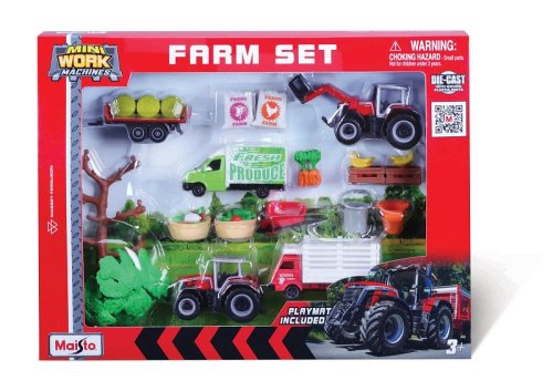 Mini Work Machines - Super farmársky set Massey Ferguson. Super set obsahuje: kovový model traktora Massey Ferguson s plastovými detailmi, prídavný traktor s buldozérom, dodávku, transportér, príves, strom, zeleninu a ďalšie príslušenstvo na zostavenie vlastnej farmy. Doplnky sú vyrobené z plastu. Súčasťou je aj papierová hracia podložka o rozmere 29,7 x 21 cm. Model traktora o veľkosti 3'' (cca 7,5 cm) je vyrobený z tlakovo liateho kovu. Rozmery balenia: 23,2 x 20,49 x 4,45 cm. Vek: 3+
