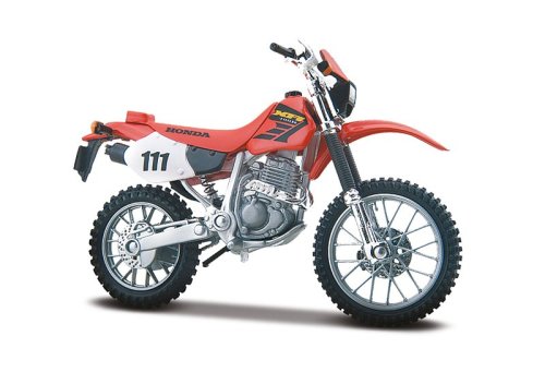 Honda XR400R. Kovové modely motocyklov v modelovom meradle 1:18. Motocykle majú otáčavé riadidlá a odpruženú zadnú nápravu. Sú usadené na čiernom plastovom podstavci. Rozmery balenia: 16x10,5x7cm. Vek: 3+