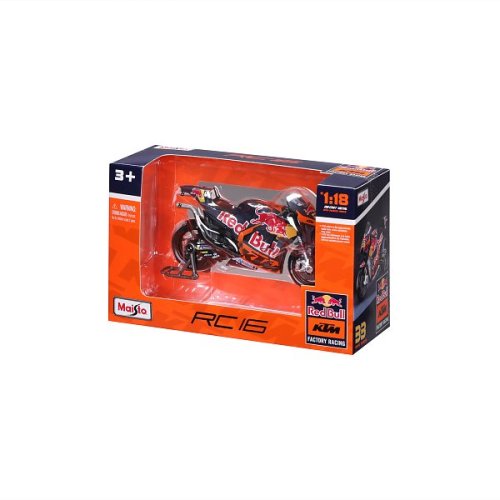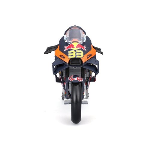 Motocykel GP Racing 1:18 Red Bull KTM Factory Racing 2023, #33 Brad Binder. Model oficiálneho licencovaného závodného tímu má veľmi dokonalé, detailné prevedenie jednotlivých častí a kvalitné farebné prevedenie. Kovový model s plastovými detailmi. Model má voľne sa otáčajúce kolesá a je vrátane podporného stojana. Balené v krabičke. Nevhodné pre deti do 3 rokov. Rozmery balenia: 10,5 x 17,1 x 7 cm. Vek: 3+
