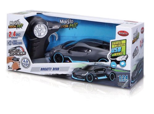 Bugatti Divo 1:24 RC Premium. Model športového vozidla značky Maisto na diaľkové ovládanie. V autíčku je zabudovaná lítiová batéria, ktorú je možné dobíjať cez USB kábel (je súčasťou). Ovládač funguje na 2xAAA batérie (sú súčasťou). 2,4 GHz – až 4 osoby. Pištoľový ovládač. Dosah ovládania až 35 m. Doba nabíjania 45 minút. Rozmery balenia: 13,3 x 31,75 x 11,1 cm. Vek: 5+