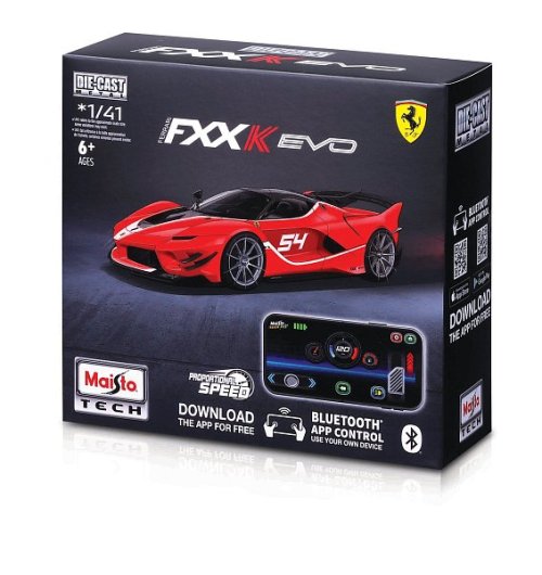 Ferrari FXX-K EVO v mierke 1:41, červená farba. Model so svetlami od značky Maisto vyrobený z kovu je ťažký, kvalitný a odolný. Ide o autentický dizajn a vynikajúcu kvalitu. Auto môžete ovládať pomocou chytrého telefónu prostredníctvom Bluetooth. Auto funguje na dobíjaciu batériu pomocou USB kábla (oboje súčasťou balenia). Rozmery balenia: 14 x 15,2 x 5,6 cm. Vek 6+