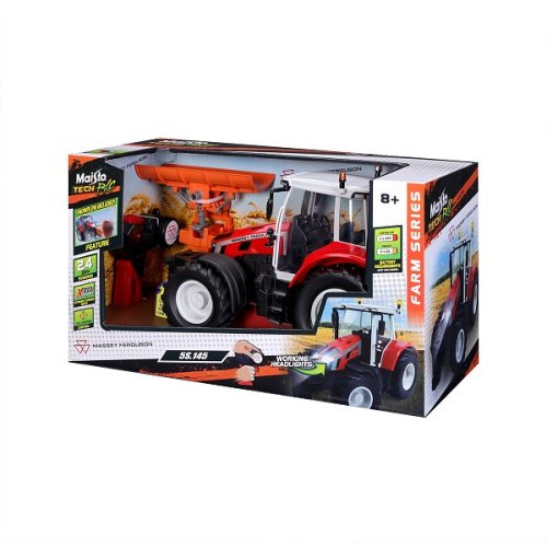 Traktor Massey Ferguson s radlicou a diaľkovým ovládaním 2,4 GHz. Extrémny pomer otáčania, plne funkčné ovládanie, funkčné svetlomety. Pištoľová rukoväť na jednoduché ovládanie. Predné a zadné konektory, riadenie predných kolies s detailmi dezénu pneumatík. Predná radlica sa dá natáčať zo strany na stranu. Mierka 1:16. Vyžaduje 2 x AAA a 4 x AA batérie (nie sú súčasťou balenia). Rozmer balenia: 45x25x20cm. Vek: 3+