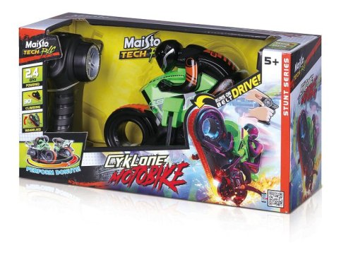 7" Motocykel Cyklone, zelená farba. Plastový model značky Maisto na diaľkové ovládanie. Motocykel so špeciálnym dizajnom kolies pre skvelý zážitok z jazdy. Motocykel funguje na 4x AAA batérie (nie sú súčasťou). Ovládač má dosah až 35 metrov a používa 2x AAA batérie ( nie sú súčasťou) Rozmer balenia: 27,94x15,24x11,43 cm.