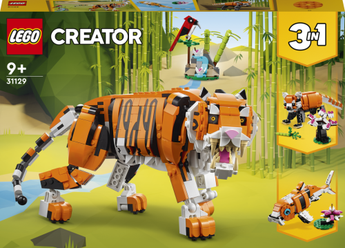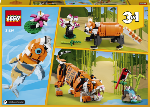 Doprajte nadšeným milovníkom zvierat možnosť prežívať zábavné príbehy so stavebnicou LEGO® Creator 3 v 1 Majestátny tiger (31129). Stavebnica prináša model tigra z kociek s polohovateľným chvostom, nohami, telom, hlavou a papuľou. Tiger dokonca dokáže meniť výrazy na tvári.