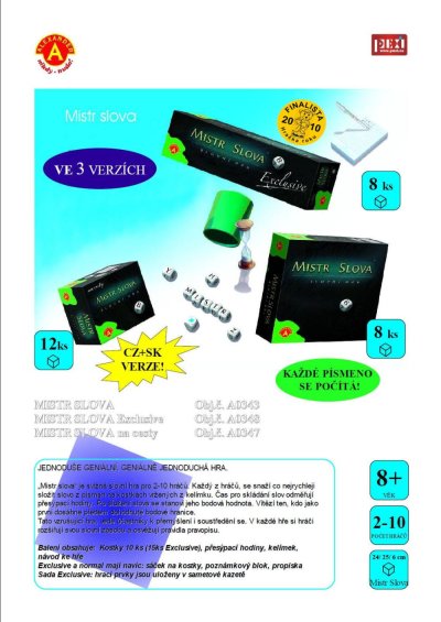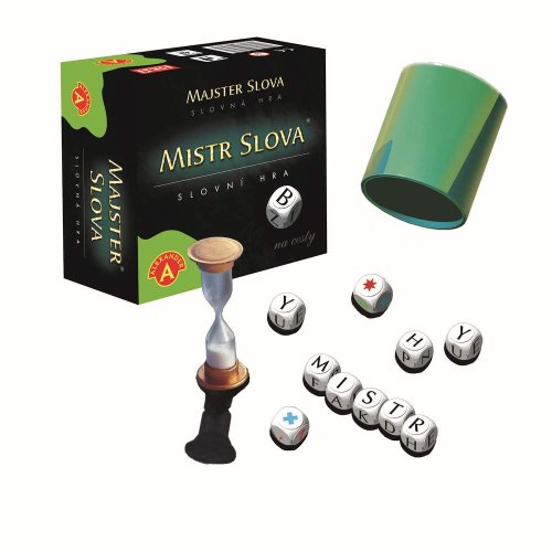 Slovná hra - menšie, úsporné cestovné balenie - Majster slova je svižná slovná hra pre 2-10 hráčov. Hráči sa snažia, v čase vymedzenom presýpacími hodinami, zložiť slovo z písmen na kockách vrhnutých z téglika. Po zložení slova sa stanoví jeho bodová hodnota. Víťazí ten, kto ako prvý dosiahne vopred dohodnutú bodovú hranicu. Hra, prinúti účastníkov premýšľať aj sústrediť sa. V každej hre si hráči rozširujú svoju slovnú zásobu a osviežujú pravidlá pravopisu. Nepotrebujte žiadny hrací plán, nehrozí rozsypanie písmeniek pri hre.