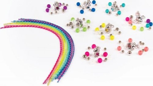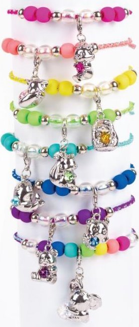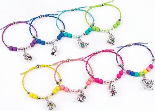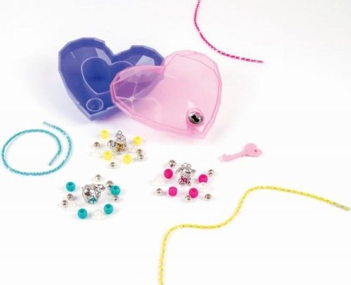 sada obsahuje: 3 náramky s príveskami a kryštálom SWAROVSKI, krabičku v tvare srdca, kľúčik, korálky, farebné šnúry a inštrukcie
