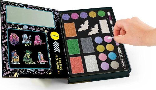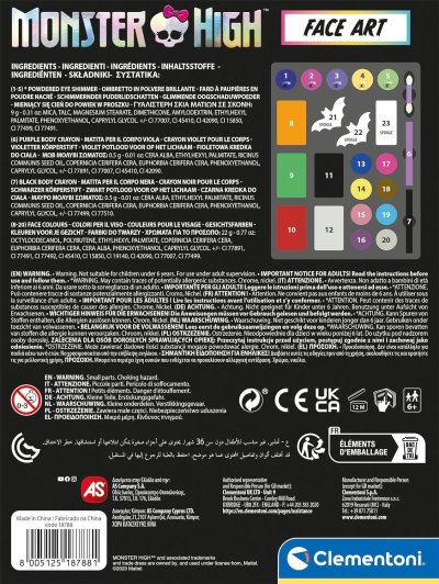 Face Art Monster High od Clementoni je sada make-upu a doplnkov ideálna pre dievčatá, ktoré milujú sériu Monster High. S touto sadou si môžete vytvoriť fantastický make-up inšpirovaný postavami Monster High a premeniť sa na skutočné štýlové príšery ako sú Frankie Stein, Draculaura alebo napríklad Cleo DeNile. Súprava obsahuje očné tiene, ceruzky a farby vhodné pre jemnú dievčenskú pleť pre bezpečné experimentovanie. Obsah balenia: farebné očné tiene farebné ceruzky na telo farby na tvár hubky penový aplikátor zrkadlo