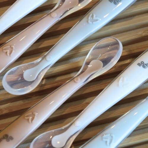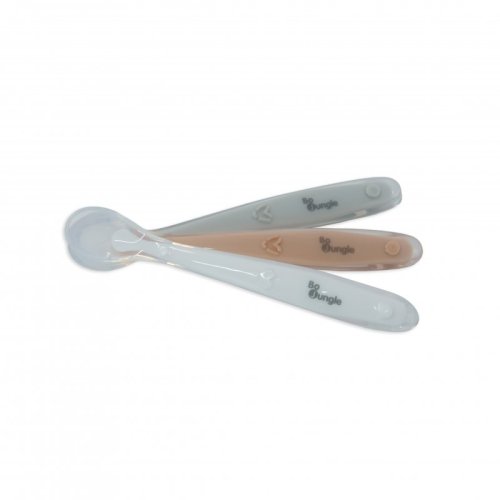 Jedálenské lyžičky s mäkkými silikónovými zakončeniami, ktoré sú šetrné k citlivým detským ďasnám.