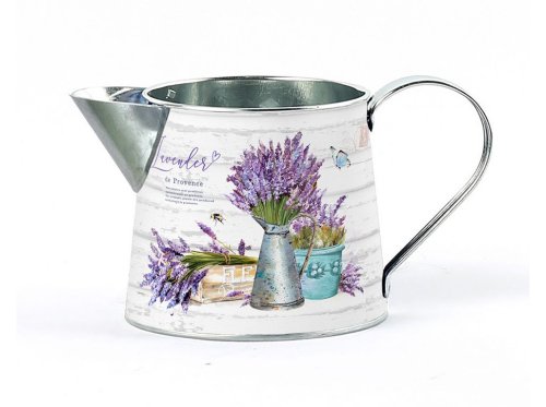 Plechová kanva s motívom levandule vo farebnej farbe, ideálna pre romantické a vidiecke interiéry. Jej rozmery sú 185x115x105mm.