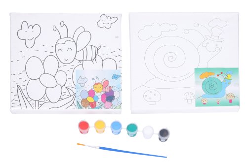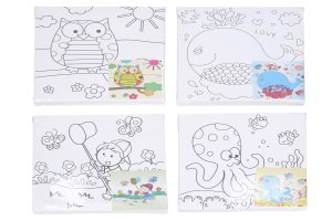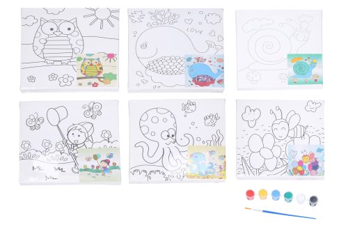 Maliarske plátno s predlohou o veľkosti 20x20 cm + farby a štetec. 6 variant: chlapec, včela, sova, chobotnica, slimák a veľryba.