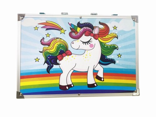 Maliarsky kufrík hliníkový je ideálnou voľbou pre mladých umelcov a tvorivé deti, ktorí chcú rozvíjať svoju fantáziu a zručnosti v kreslení a maľovaní. Tento praktický kufrík má pevnú hliníkovú konštrukciu s kovovými rohmi pre zvýšenú odolnosť a je zdobený veselým motívom jednorožca s pestrou dúhovou hrivou na svetlo modrom pozadí s hviezdičkami a dúhou, čo z neho robí atraktívny a farebný doplnok, ktorý deti rady vezmú kamkoľvek so sebou.