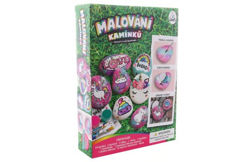 Maľovanie kamienkov. Sada obsahuje 8 kamienkov, 5 farbičiek, 2 štetce, 52 lepiacich drahokamov, atď. Balené v krabičke. Rozmery balenia cca 18x25x5 cm. Vek 3+