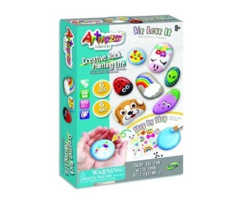 Vytvorte si farebný a veselý kamienok. Môžete maľovať, nalepovať a ozdobiť podľa vlastných predstáv alebo sa inšpirovať motívmi na krabici. Vyberte si kamienok, fixkou si nakreslite, čo Vás napadne a môžete začať s farbičkami. Balenie obsahuje: 6 kamienkov, 6 x vodové farby, 2 štetce, samolepky a fixku. Vek: 8+ Rozmery balenia: 16,5 x 25 x 5 cm